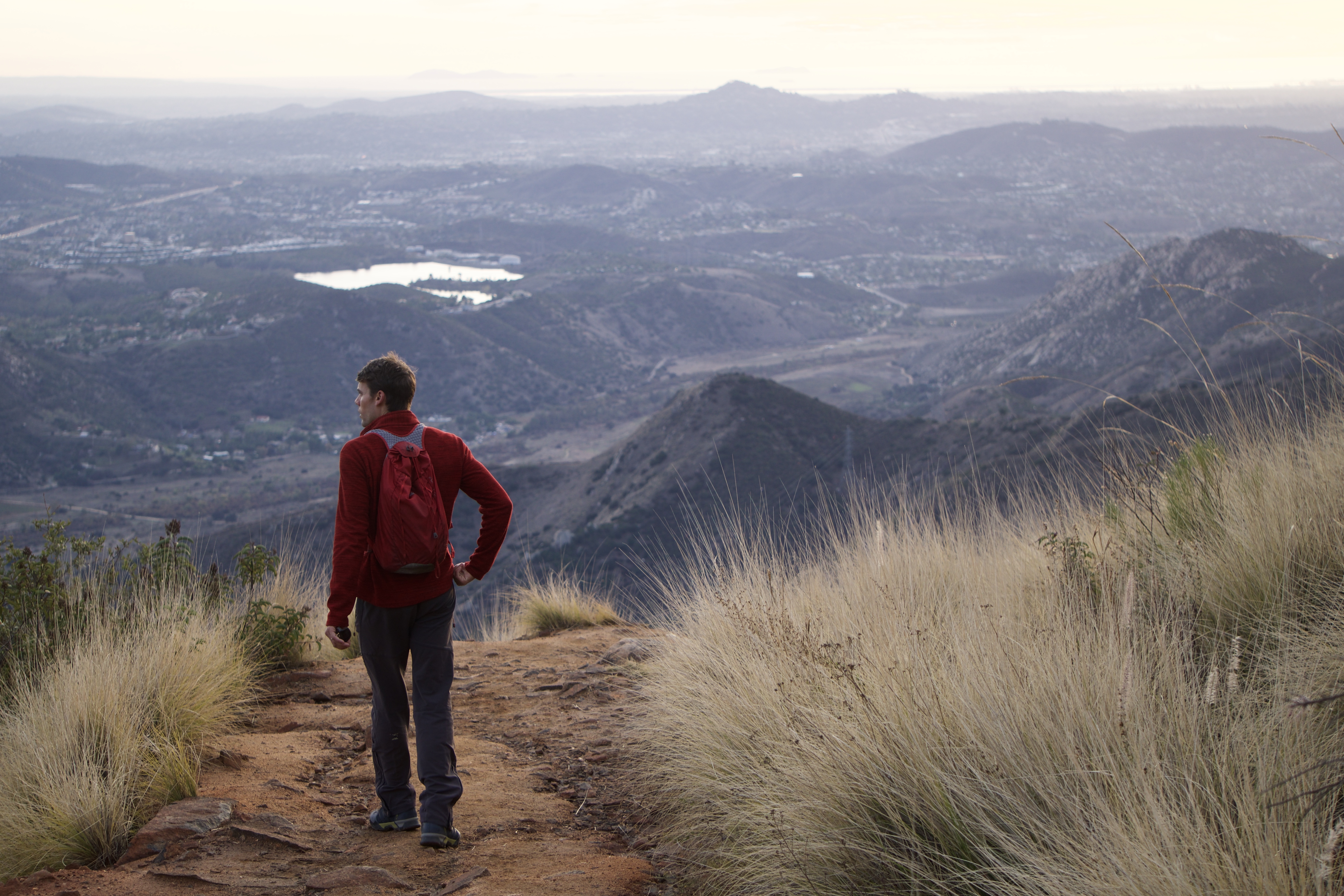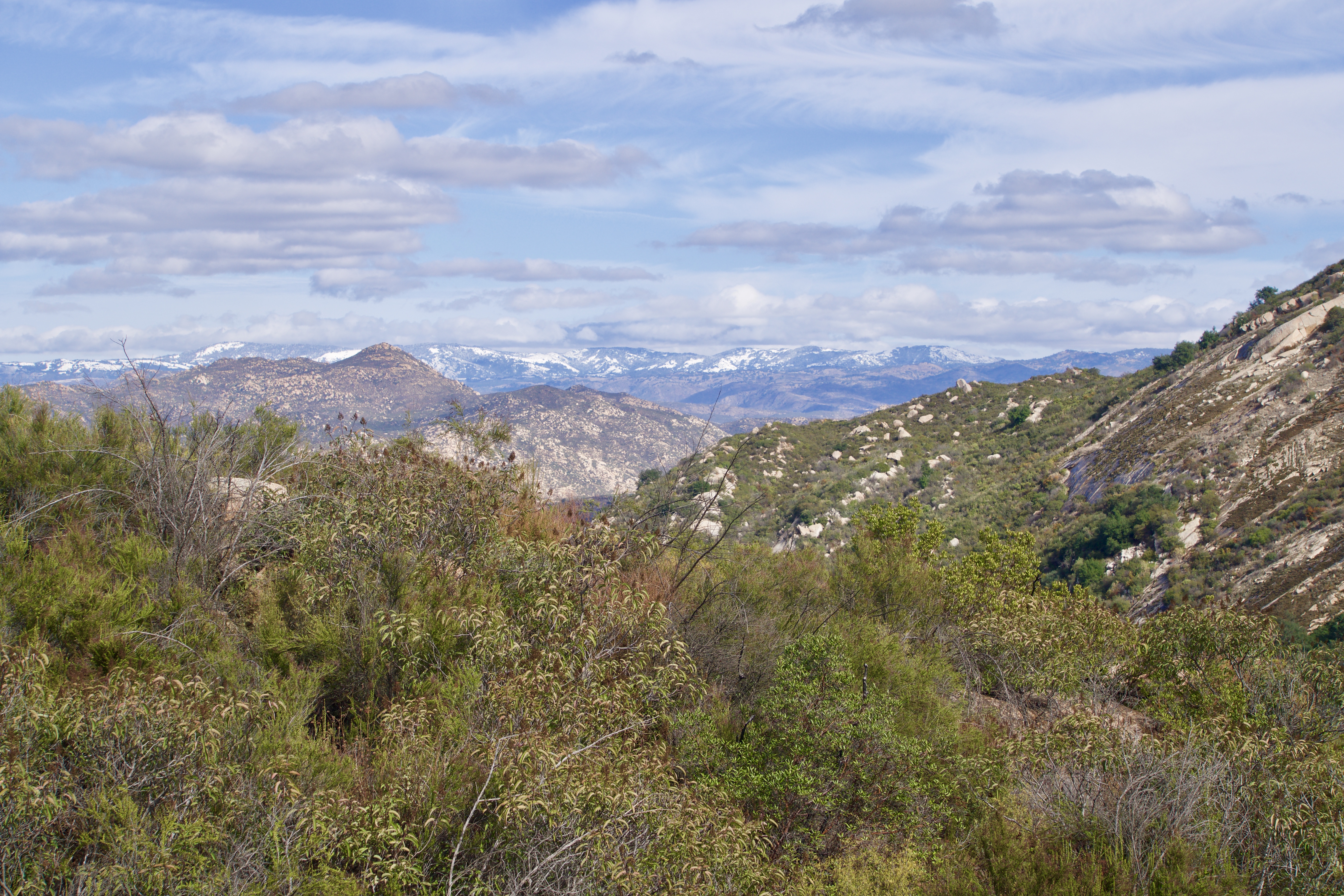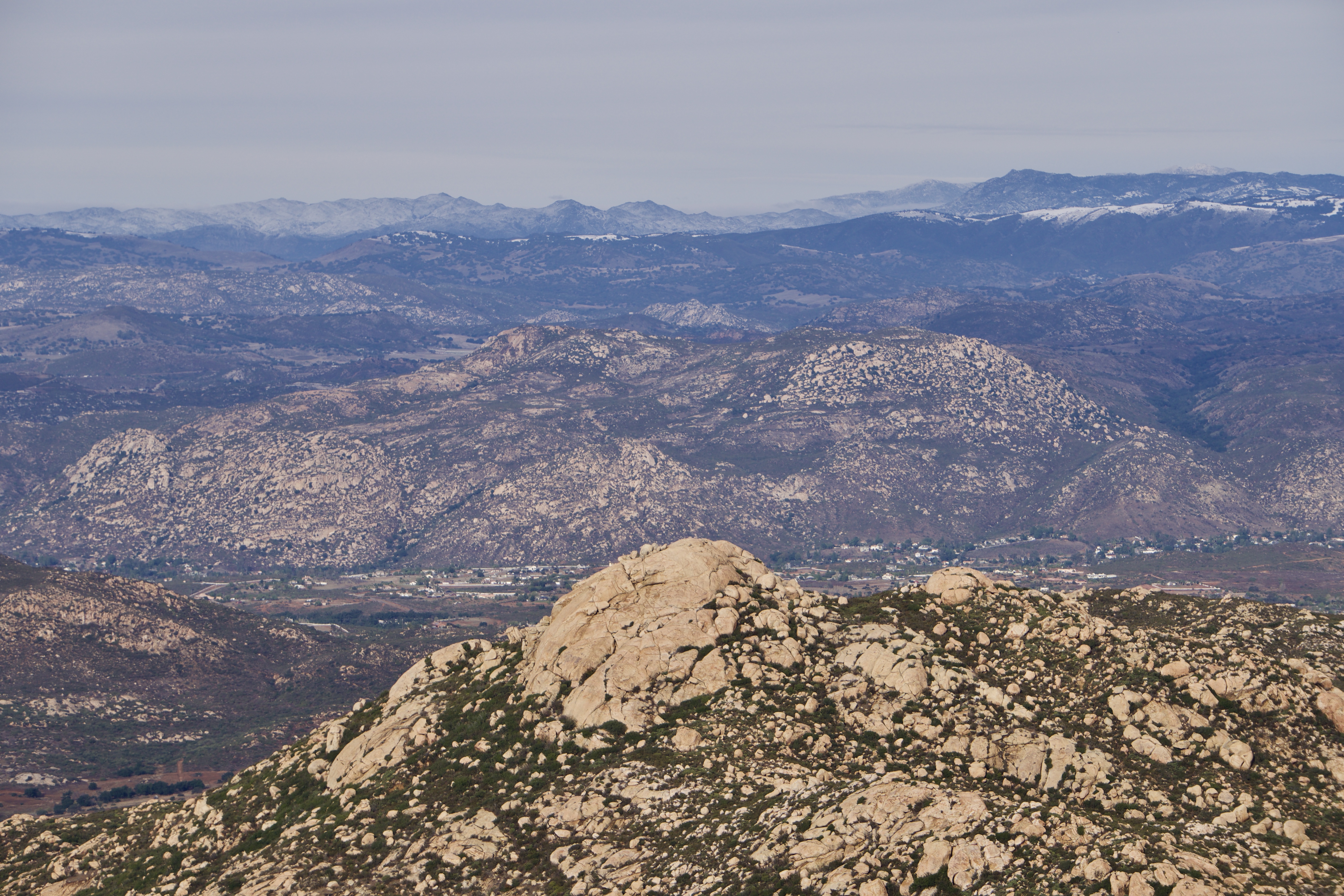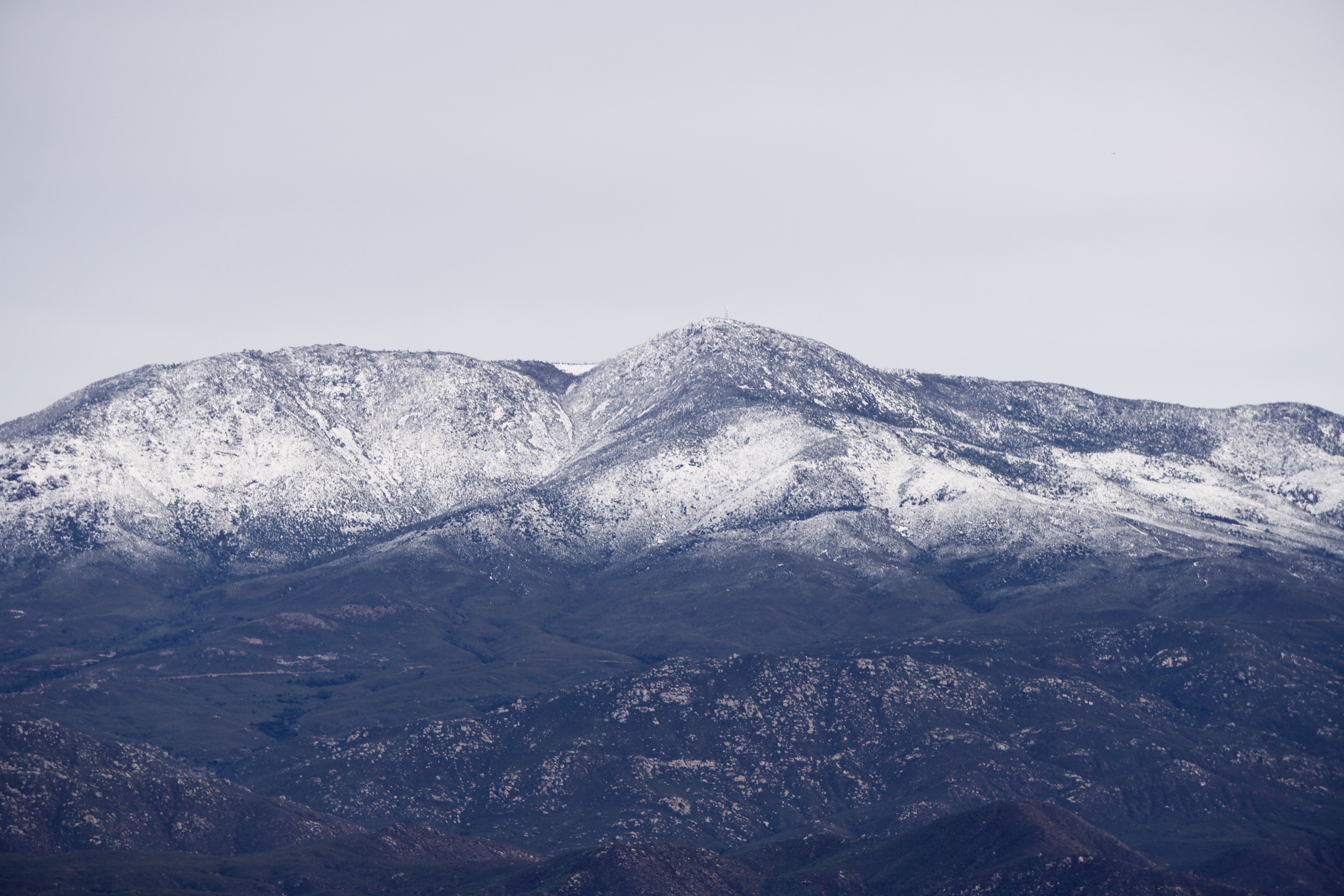 After heavy rain in San Diego this week, we hiked to the summit of El Cajon Mountain to catch a glimpse of snow-dusted mountains just one range further east. With the air so clear, we could see north all the way to the towering Mt San Jacinto, and south-west to the Islas Coronado off the coast of Baja California, Mexico. It’s an unexpectedly difficult walk, with steep and relentless climbs and descents. For our efforts, we were rewarded not only with snow but also with the colorful autumn display of the coastal sage scrub, and a fiery sunset over the Pacific Ocean.