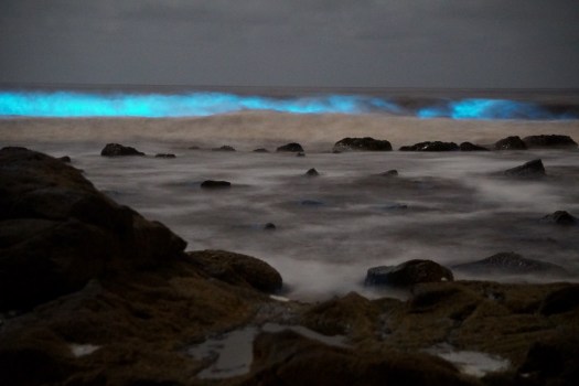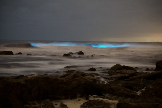 I was surprised but hardly startled… just mesmerised. The sight of glowing waves stirred memories of bioluminescent nature elsewhere, at other times. As a kid in New Zealand, I recall jumping off the boat at night and sensing that the splash was luminous. In Kenya, Eric and I paddled across an inky black lagoon and saw tiny sparks leap away from the canoe, mixing with reflected stars.