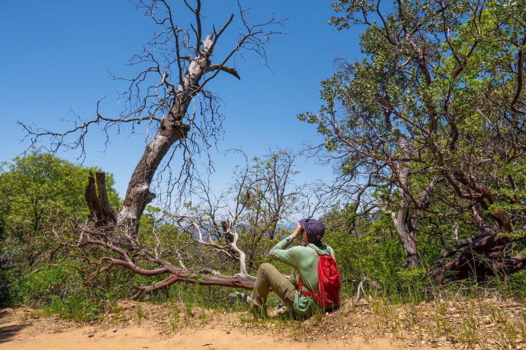 We skipped the coffee and pressed on westward. Short on time and with several more habitats to go before the end of the day, this was beginning to feel like the Amazing Race. We stopped at one of my restoration sites in Carmel Valley, which has both riparian woodland and coastal sage scrub, and where I knew we would find black-headed grosbeaks and California gnatcatchers. Whenever we go birding, my ability to identify birds by their song is rusty at first and then improves. As we walked the sycamore-lined trail, I stared at the ground and focused on listening, calling out the species as I heard them. There was the fluty song of the grosbeak in the trees to my right. To my left, a wrentit called out in a series of accelerating pits like a bouncing ball. Overhead I could hear northern rough-winged swallows, and above them white throated swifts. Hiking uphill into the shrubs, we spotted a bushtit and heard the rest of its straggling flock of tiny friends, and then finally, from somewhere downslope, the kitten-like mew of the gnatcatcher.