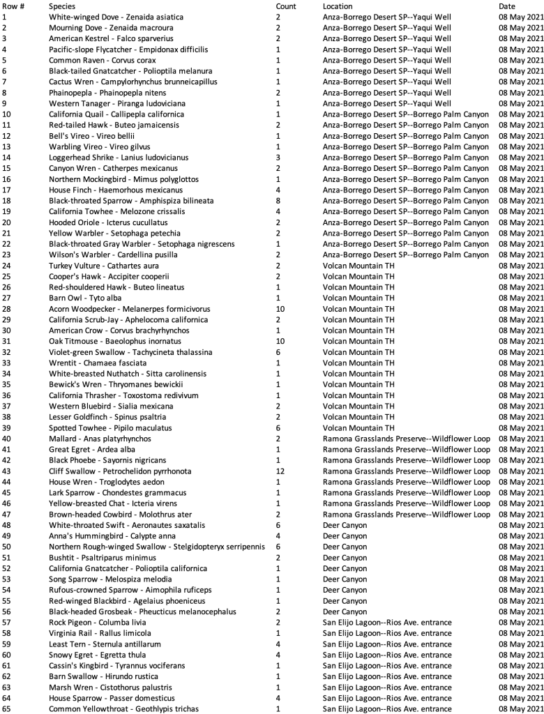 San Diego County has more species of birds than any other county in the United States: 520 species. On Global Big Day, Eric and I set out to see as many of them as we could.