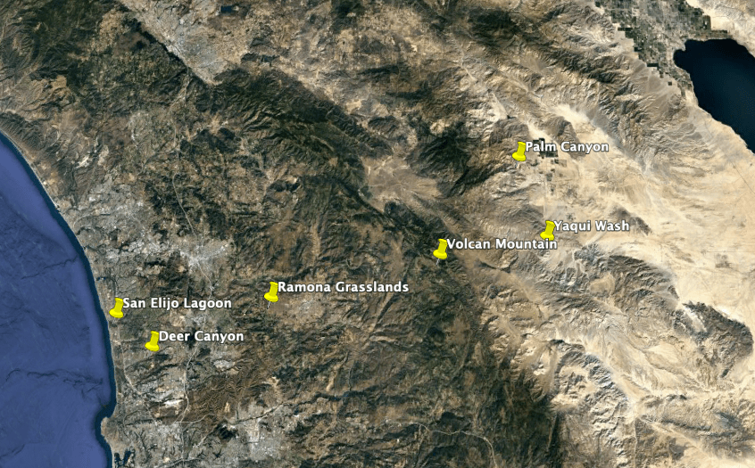 This year, to get that high species count, we decided to bird in as many habitats as possible. Switching habitat’s in San Diego is quickly achieved by moving east to west or west to east. Farthest west lies the coast, where surf meets sand and cliffs. Just inland, beaches transition to lagoons and estuaries where rivers widen and mix with the tide. Upstream from these lagoons we encounter riparian woodlands, where river-flows support willows, sycamores, oaks and cottonwoods. Land uphill of rivers is usually covered in coastal sage scrub and chaparral, two types of scrublands that typify our mediterranean climactic region. Coastal sage scrub occurs closer to the coast and includes drought deciduous sages, sagebrush, bush sunflowers and buckwheats, as well as succulents like agaves, dudleyas, chollas and prickly pear. Chaparral occurs further inland and includes chamise, lilac, manzanita and yucca, as well as miniature, dark green forests of evergreen shrubs such as lemonade berry, toyon and scrub oak. Grasslands can be found where ranching has occurred and mixed introduced grasses with native bunch grasses. As we move further east, we meet the mountains: Mount Palomar, the Cuyamacas, and the Lagunas, to name some of our ranges. In the mountains, the cooler temperatures at elevation support oak woodlands and, higher yet, pine forests. From their summits, the mountains’ eastern slopes drop suddenly into the desert of Anza-Borrego below, a hot, dry land of cactus, ocotillo, and agave, of flash-flood-resistant ironwood and mesquite, and, in tucked-away canyons, palm oases.